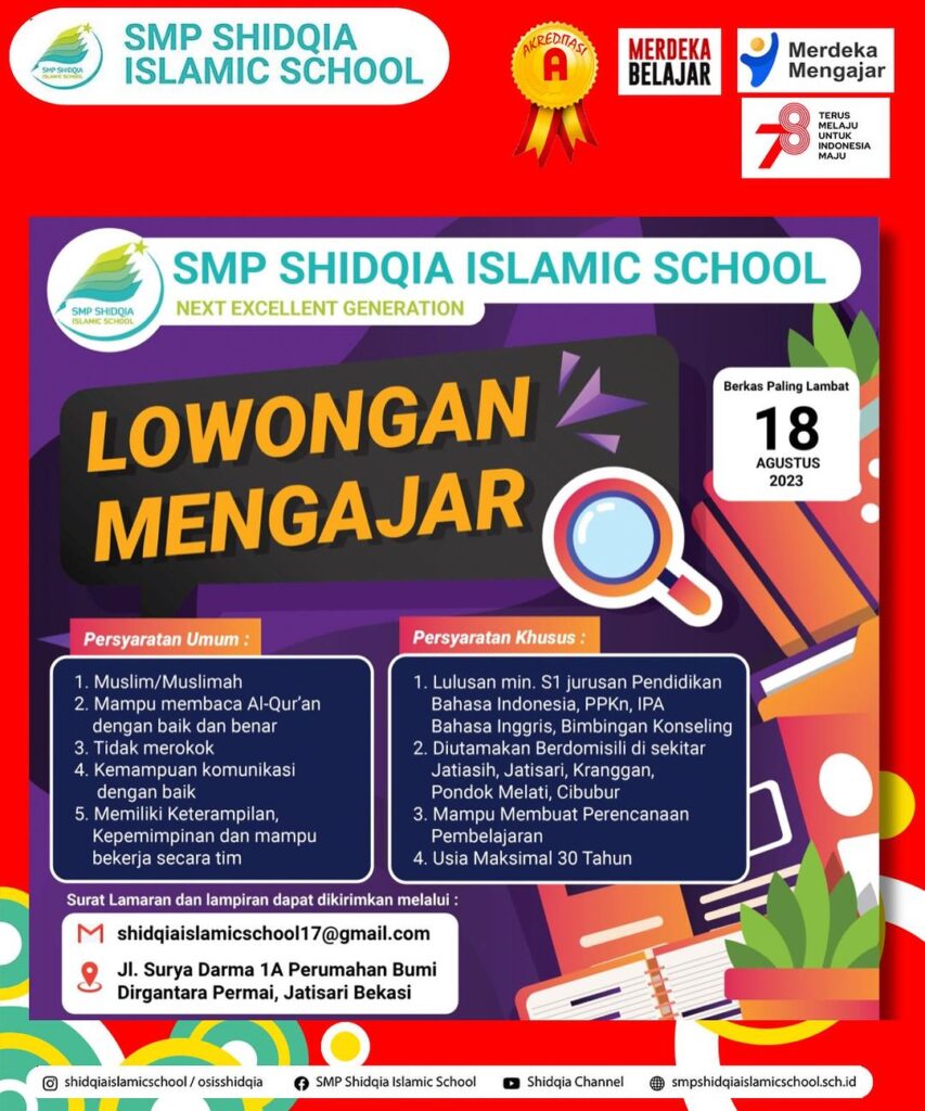 Lowongan Mengajar – 050823 [Info Lowongan Guru] Bahasa Indonesia, PPKn, IPA, Bahasa Inggris & BK *Persyaratan Umum:* 1.Muslim/Muslimah 2.Mampu membaca Al Qur’an dengan baik dan benar 3.Tidak merokok 4. Memiliki Kemampuan komunikasi yang baik 5. Memiliki Keterampilan kepemimpinan dan mampu bekerja secara tim. *Persyaratan Khusus* 1.Lulusan min S1 jurusan Pendidikan (Linear) 2.Diutamakan Berdomisili di sekitar […]