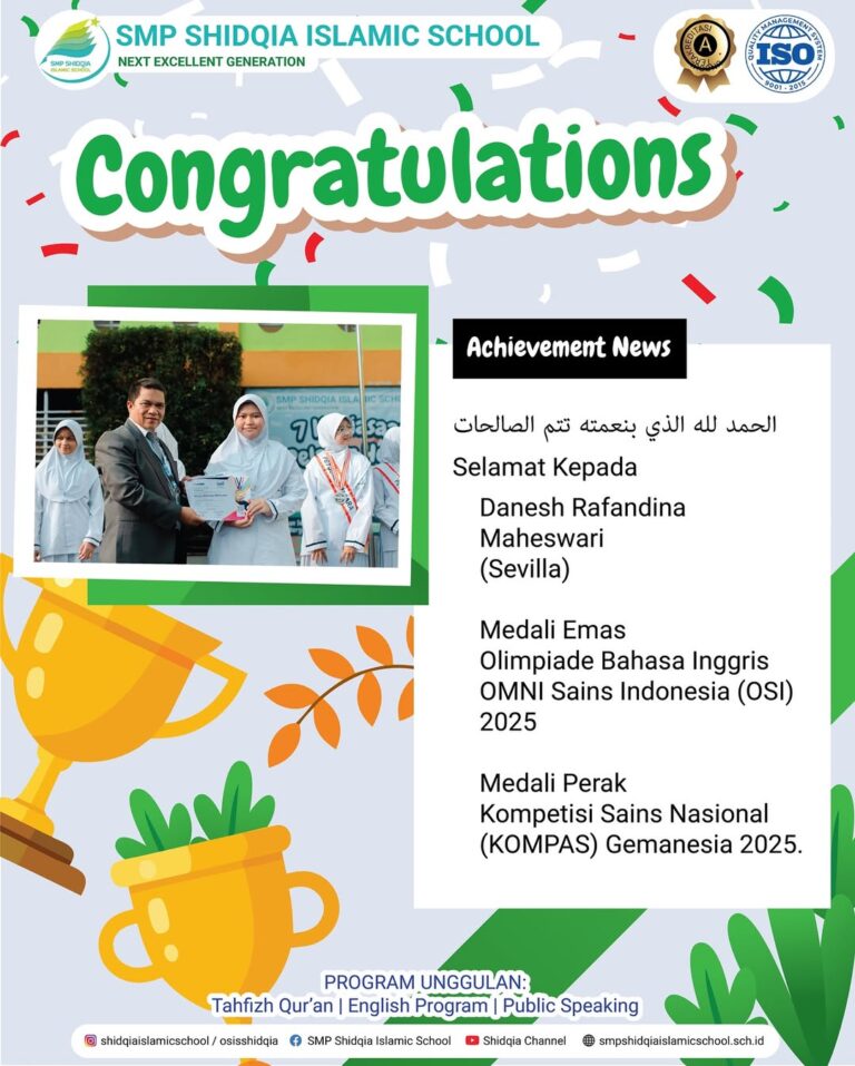 2. Danesh Rafandina Maheswari (Sevilla) – Medali Emas Olimpiade Bahasa Inggris OMNI Sains Indonesia (OSI) 2025 & Medali Perak Kompetisi Sains Nasional (KOMPAS) Gemanesia 2025.