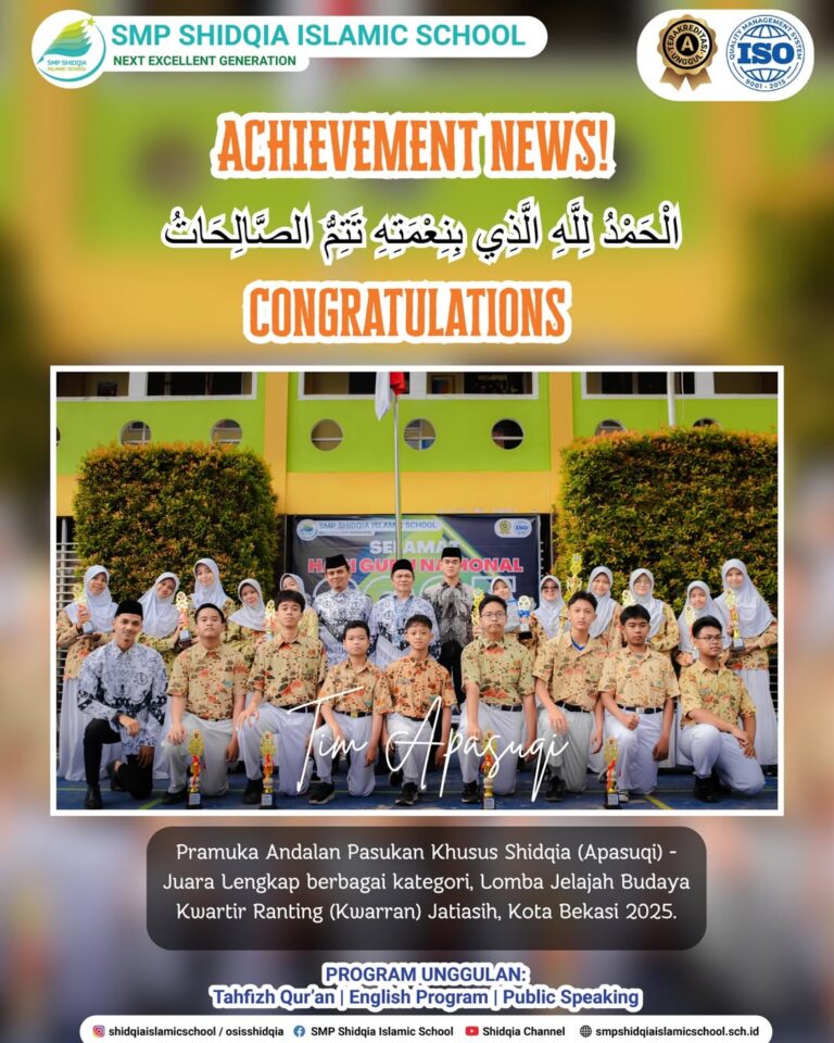 4. Pramuka Andalan Pasukan Khusus Shidqia (Apasuqi) – Juara Lengkap berbagai kategori, Lomba Jelajah Budaya Kwartir Ranting (Kwarran) Jatiasih, Kota Bekasi 2025.