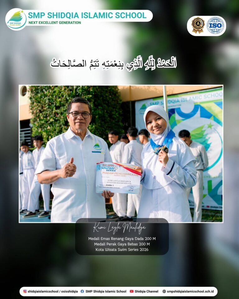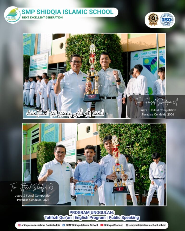 1. Tim Futsal Shidqia – All Shidqia Final, Futsal Competition at Paradisa Cendekia Festival 2026. 2. Kumi Layla Maulidya (Riyadh) – Medali Emas Renang Gaya Dada 20m & Medali Perak Gaya Bebas 20m, KOTA WISATA SWIM SERIES 2026.
